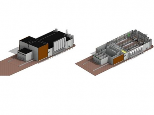 De installatie wordt uitgevoerd in drie tinten grijs. Deze geven de drie procesonderdelen aan: loshal, bunker en droogproces. We bouwen de installatie naast het rode gebouw van de afvalenergiecentrale.